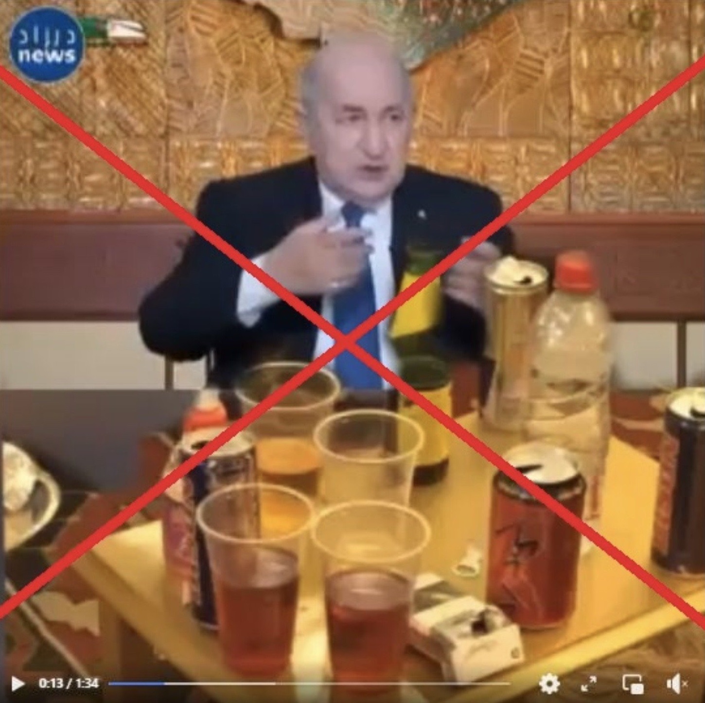 البوابه - حصد فيديو مفبرك حرص ناشروه على إظهار الرئيس الجزائري عبد المجيد تبّون في حالة سكر وهو يتكلم ببطء شديد أمام طاولة تعج بالمشروبات الكحولية على آلاف المتابعات والمشاركات والتعليقات.