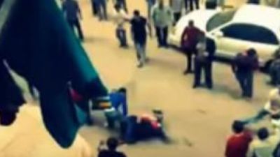 وتبدو المراة في الفيديو ملقاة على الاسفلت فيما يحمل الرجل جسما في يده قيل انه سكين ويحاول ذبحها بواسطته، ثم يعاجله بعض المارة بالركل وبقذفه بالحجارة لابعاده عن المراة.