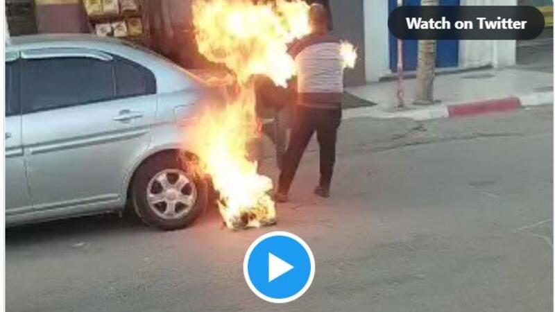 قيام المواطن/حمدي مؤمن دغمش23عام بحرق نفسه وحالته متوسطة وذلك بسبب قيام شرطة المرور بعمل مخالفة له علي مفترق السرايا وتم نقل الحالة بواسطة سيارة مدنية pic.twitter.com/BnUPmyOfOX