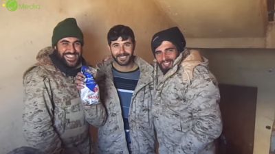 لقطات أخرى أظهرت مقاتلين من الحزب وهم يحاولون الترفيه عن أنفسهم، قائلين بصوت جماعي: "نحن الآن بحلب، بمنطقة أسفل تلة العيس، كنا مقطوعين من القهوة".