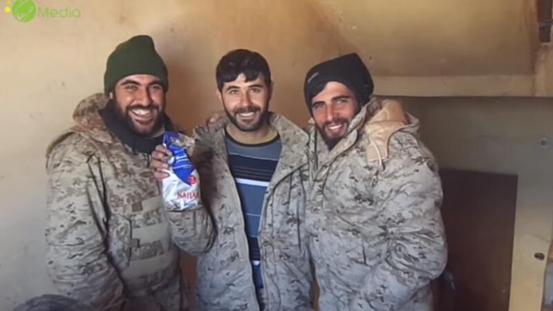 عناصر حزب الله يتضاحكون أثناء حملهم لكيس "قهوة النجار" اللبنانية في ريف حلب - يوتيوب