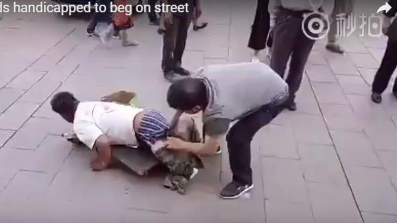 ففي لحظة غير متوقعة، انقض أحد المارة الرجال على متسول يزحف على بطنه مستعينا بلوح تزلج، وقام الرجل بنزع سروال المتسول وسط الشارع، لتظهر ساقاه كاملتين ولكنهما مربوطتين تحت ملابسه ليظهر أنهما مبتورتان ويسهل عليه خداع ضحاياه لاستجداء عطف الناس وكسب المال.