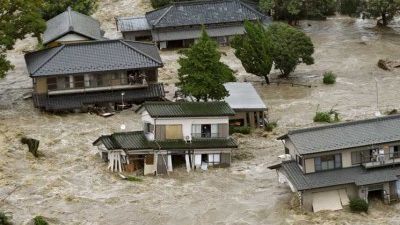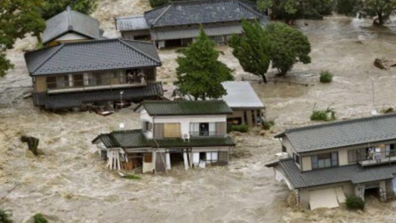 وعرضت الشبكة العامة (ان اتش كي) لقطات لنهر كينوغاوا عند انهيار احدى ضفتيه في مدينة جوزو (شمال طوكيو) ليجتاح في موجة هائلة جزءا من المدينة التي تضم 65 الف نسمة، وذلك بعد امطار غزيرة هطلت على البلاد هذا الاسبوع.