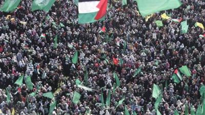 وشهدت مظاهرة اليوم الجمعة مشاركة متظاهرين يرفعون الاعلام الخضراء والسوداء وهي اعلام حماس والجهاد الاسلامي في علامة على التقارب بين الفصيلين اللذين يتشاركان نفس الفكر الاسلامي ويدعوان الى تدمير اسرائيل.