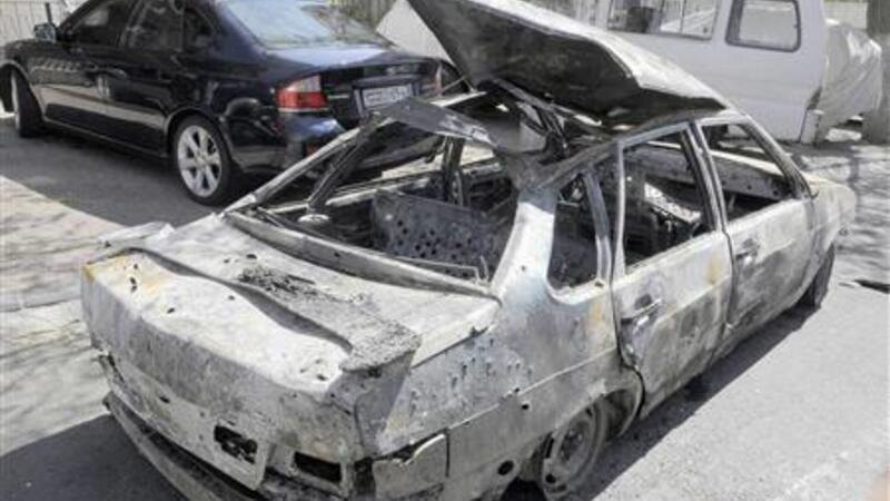 سيارة لحقت بها اضرار بعد قصف قرب السفارة الصينية في دمشق يوم الاثنين