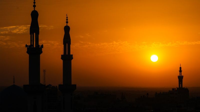 مآذن مدينة رفح، جنوب قطاع غزة، في لحظة غروب الشمس، 21 ديسمبر 2023، وسط استمرار المعارك بين قوات الإحتلال الإسرائيلي والمقاومة الفلسطينية حماس. ( وكالة فرانس برس)