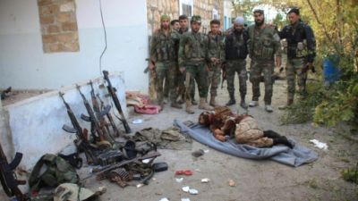 جنود من الجيش السوري يقفون امام جثة مقاتل اسلامي