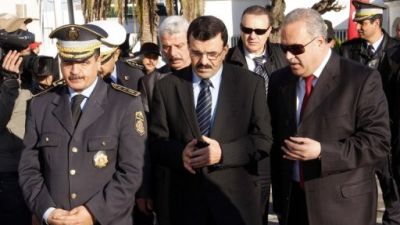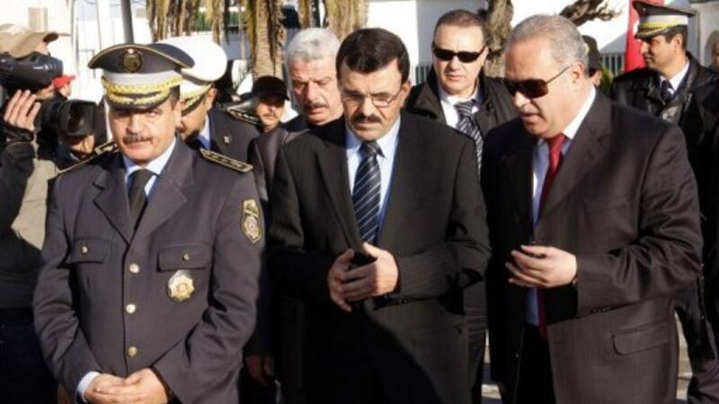 وزير الداخلية التونسي علي لعريض (وسط) بين مسؤولين في مركز للشرطة في تونس