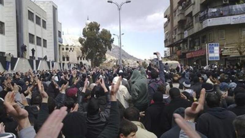 وأظهرت لقطات منشورة على موقع يوتيوب ويفترض أنها أخذت قبل اطلاق الرصاص حشدا يسير في حي الحجر الاسود حاملين لافتات تعبر عن التضامن مع مدينة حمص المحاصرة وهم ينشدون "عيني على شهداء سوريا وشبابها."