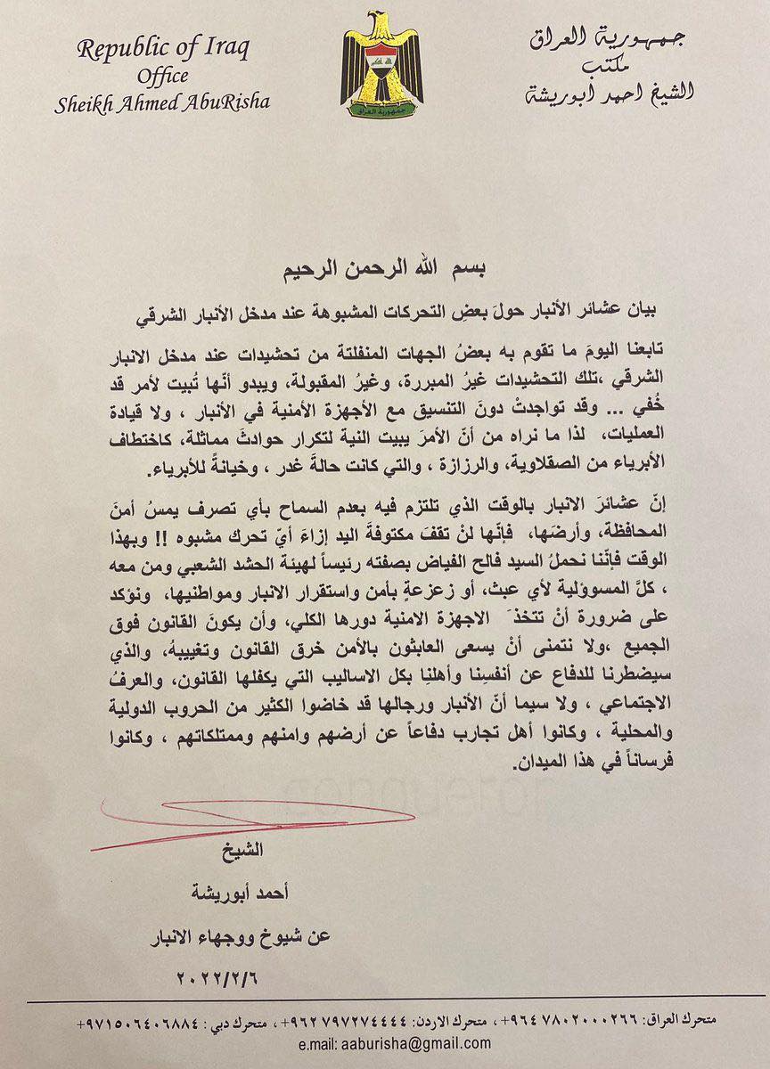 وأردف أن "عشائر الأنبار بالوقت الذي تلتزم فيه بعدم السماح بأي تصرف يمس أمن المحافظة وأرضها، فإنها لن تقف مكتوفة اليد إزاء أي تحرك مشبوه!!".