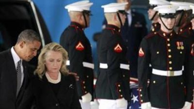 وأضافت وهي تقف امام أكفان الرجال الأربعة التي لفت بالأعلام الامريكية "شاهدنا الهجوم العنيف على موقعنا في بنغازي والذي اودى بحياة هؤلاء الرجال الشجعان. شاهدنا الغضب والعنف الموجه إلى سفارات امريكا بسبب فيلم بشع على الانترنت ليست لنا اي علاقة به."