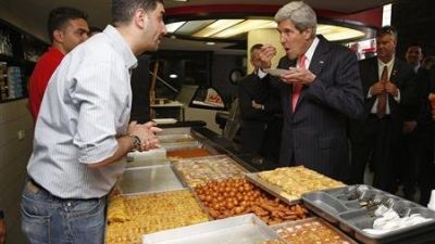 ترك وزير الخارجية الأمريكي جون كيري المسار الدبلوماسي يوم الخميس وخرج إلى أحد شوارع الضفة الغربية حيث تناول شطيرة شاورمة وكنافة فلسطينية بالفستق.