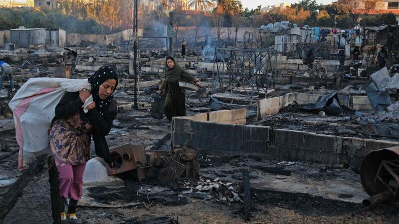 لاجئون سوريون يفرون من مخيمهم بشمال لبنان بعد إحراقه خلال شجار