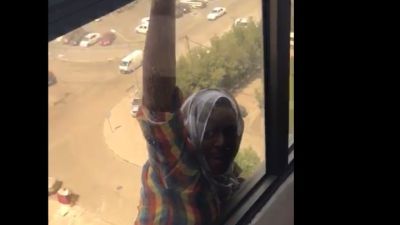 تظهر لقطات صورتها صاحبة منزل بالكويت خادمتها الإثيوبية وهي تتعلق بصعوبة بحافة نافذة المنزل من الخارج وهي تبكي وتصرخ بصاحبة المنزل "إمسيكني"، إلا أن الأخيرة ردت عليها بلامبالاة وقالت: "إقبال.. مجنونة تعالي".