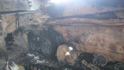 إحدى دبابات لواء الأقصى بعد حرقها من قبل عناصر اللواء