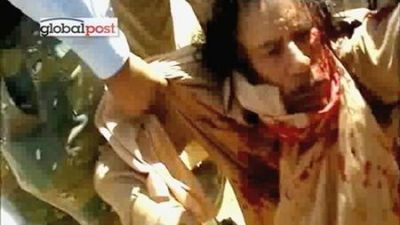 وقد ظهر القذافي في بعض الصور جريحا لكنه حي يجر الى آلية من قبل حشد هائج. وقد بدا نصف وجهه مغطى بالدماء يحيط به رجال يتناوبون على دفعه ويشدون شعره. وقد قاموا بصفعه وضربه على كتفه. وبعيد ذلك اختفى من على الشاشة بينما سمعت طلقات نارية.