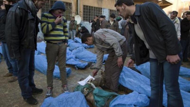 مواطنون سوريون يبحثون عن اقارب ومعارف لهم بين جثث مدنيين قتلوا والقي بهم في نهر قويق/أ.ف.ب