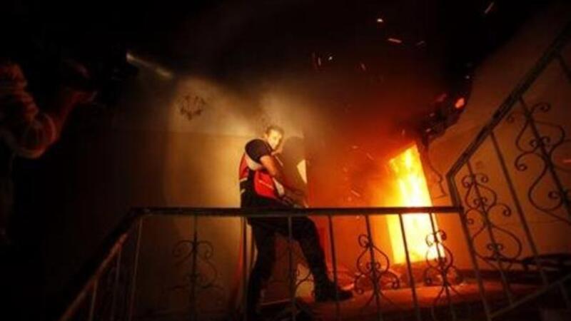 رجل اطفاء يحاول اخماد نيران اشتعلت في مبنى تعرض لغارة اسرائيلية في غزة