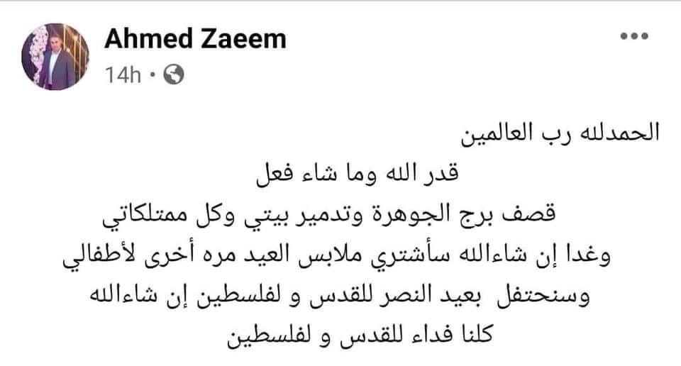 واضاف في منشور آخر : الحمد لله قصف برج الجوهرة وبيتي وغدا ساشتري ملابس العيد وسنحتفل بعيد النصر للقدس .