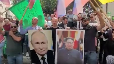 متظاهرون في الخليل يرفعون صور بوتين وكيم جونغ اون