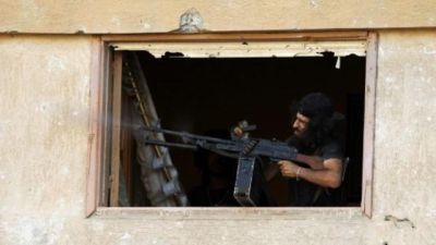 احد عناصر قوات المشير خليفة حفتر الرجل القوي في شرق ليبيا يتبادل اطلاق النار مع مسلحين في منطقة بنغازي