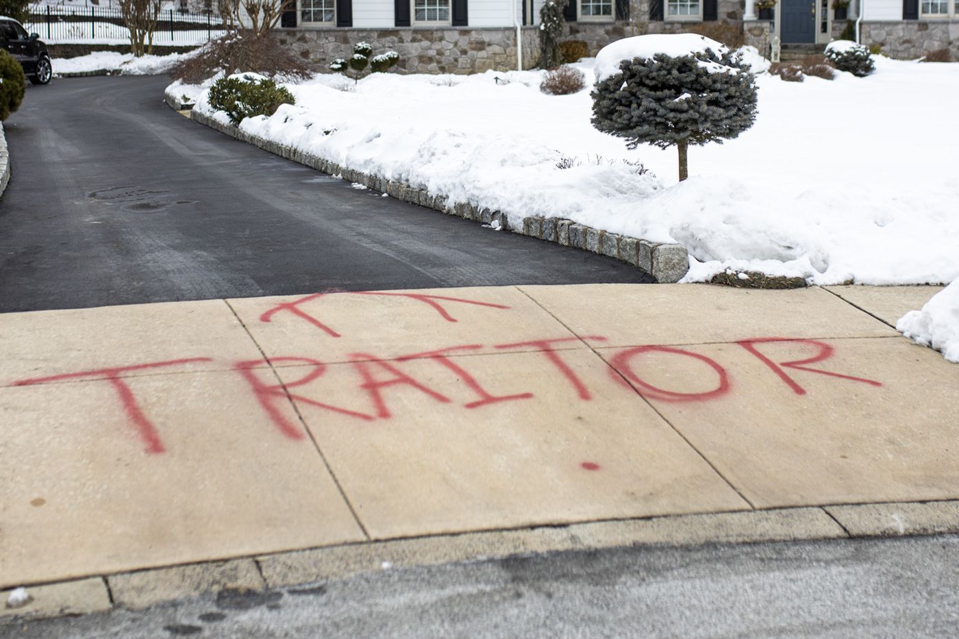 وفي وقت سابق، نشرت وسائل إعلام محلية صورة تظهر كلمة "خائن" باللون الأحمر في الشارع قرب منزل فان دير فين بضواحي فيلادلفيا وسهما يشير إلى منزله.