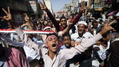 محتجون مناهضون للحوثيين اثناء مظاهرة في تعز