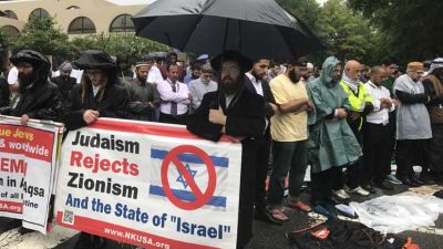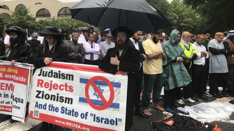 وفيما راح المسلمين يقيمون صلاة الجمعة أمام السفارة الاسرائيلية، طوق عدد من اليهود الارثوذكس الجموع بلافتات كتب عليها “كل فلسطين يجب أن تعود إلى السيادة الفلسطينية”.