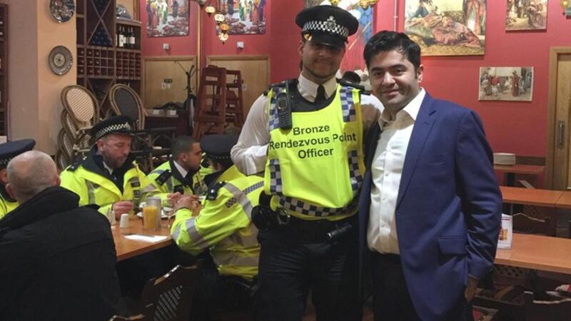 وتشير الصحيفة إلى أن السيد دوجس، مالك مطعم الكباب في بريطانيا، أبقى مطعمه مفتوحا حتى الساعة 11.30 مساء، مع خروج آخر ضابط.
