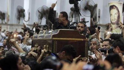 وقف مسيحيون مصريون مبتهجين خارج كنيسة العذراء والملاك ميخائيل بإحدى ضواحي القاهرة في انتظار مجيء العروس لمشاركتها وعريسها الفرحة، لكن بدلا من ذلك جاء ملتحيان على دراجة نارية وراحا يطلقان النار على الواقفين.