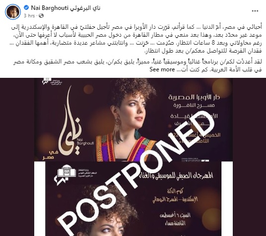 وكتبت ناي البرغوثي عبر صفحتها في فيسبوك قائلة "أحبائي في مصر، أمّ الدنيا، كما قرأتم، قرّرت دار الأوبرا في مصر تأجيل حفلتيّ في القاهرة والإسكندرية إلى موعد غير محدّد بعد".