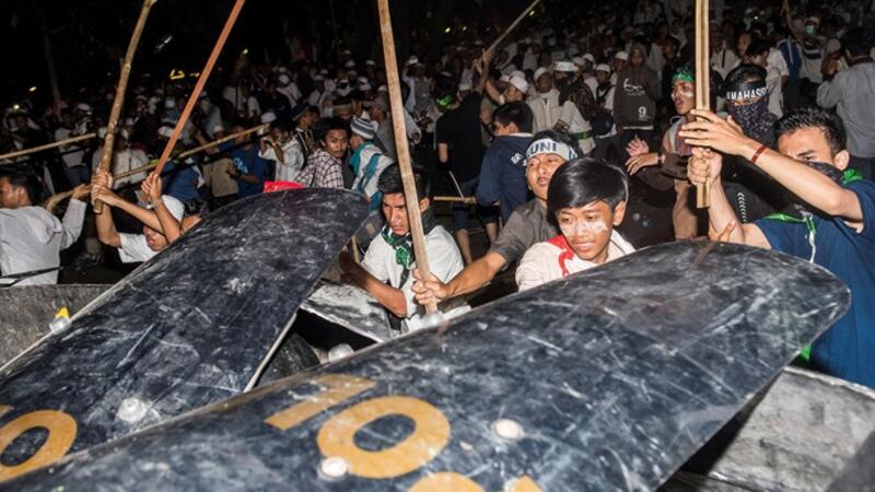 أطلقت الشرطة الإندونيسية الغاز المسيل للدموع ومدافع المياه لتفريق محتجين مسلمين متعصبين الجمعة، بعد أن خرج عشرات الآلاف في مسيرة للمطالبة باستقالة الحاكم المسيحي للعاصمة جاكرتا، الذي يقولون إنه أساء للقرآن.