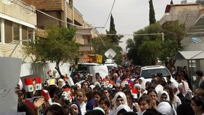 تظاهر مئات السوريين، الثلاثاء 11 نيسان، أمام مقر الأمم المتحدة على اوتوستراد المزة بالعاصمة دمشق احتجاجا على الضربة الأمريكية لمطار الشعيرات بحمص وسط البلاد.