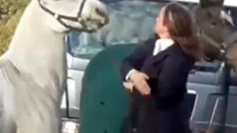 وتظهر في الفيديو فتاة وقد فقدت السيطرة على الحصان اثناء محاولتها اعادته الى قفصه.