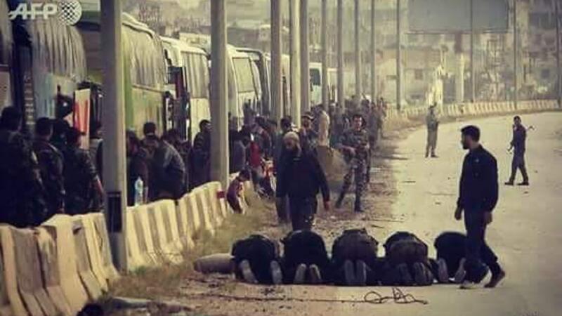 وبدأ آلاف من مقاتلي فيلق الرحمن مغادرة منطقتهم بالغوطة الشرقية مع أسرهم في انسحاب جرى التفاوض عليه متوجهين إلى أراض في شمال سوريا.