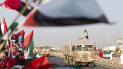 اماراتيون يرحبون بقافلة عسكريةاماراتية عائدة من اليمن