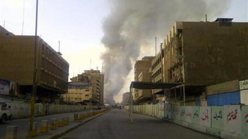 دخان يتصاعد من موقع انفجرت فيه قنابل في سوق مزدحمة في حي الشورجة التجاري في وسط بغداد يوم الاحد.