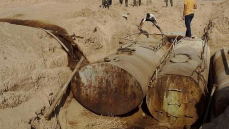 قوات عراقية تشرف على عملية نبش خزانات نفطية كان يستخدمها تنظيم الدولة الاسلامية تحت الارض جنوب غرب الحويجة في شمال العراق