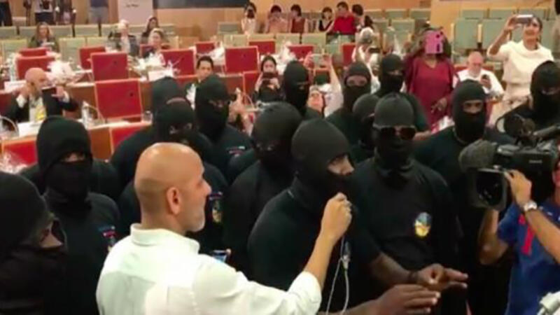وأكد الملثمون بعد أن اعتلوا المنصة الرئيسة أنهم ليسوا أشرارا وأن جميع الحاضرين في أمان، مشيرين إلى أنه لا داعي لاستدعاء قوات الأمن.