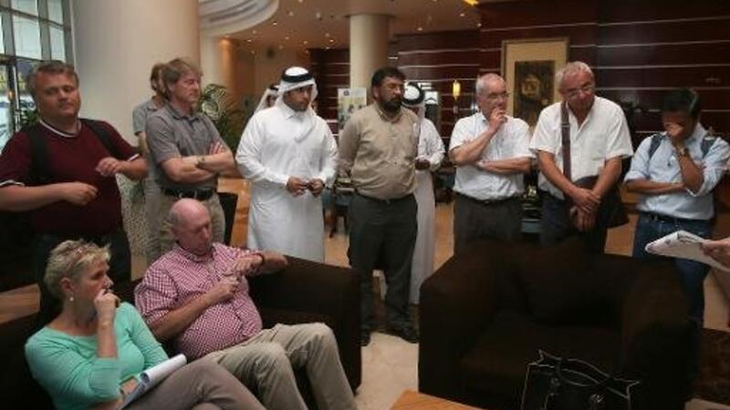 الوفد النقابي الدولي يتلقى تقريرا في الفندق قبل التوجه الى ورش بناء لتفقد ظروف العمال في قطر