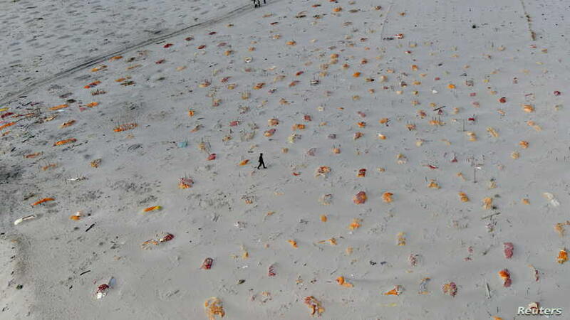 ويُظهر الفيديو الذي تم التقاطه بواسطة طائرة مسيرة قبور مترامية على مساحات شاسعة حول النهر، في هيئة تبدو كالمحارق التي يستخدمها كثير من الهنود بعد موت ذويهم.