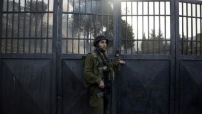جندي اسرائيلي يقف عند مدخل المدرسة