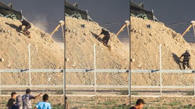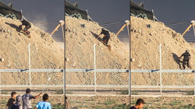 فلسطيني يجتاز السياج الفاصل ويصعد إلى تلة يتمركز بها قناصة الاحتلال شرق مدينة غزة ليصبح أمامهم وجها لوجه.