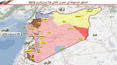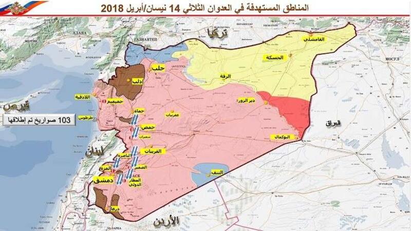 نشرت وزارة الدفاع الروسية خريطة وقائمة بأسماء المواقع التي استهدفتها قوات العدوان الثلاثي على سوريا وبررت عدم صدها لاكثر من 103 صواريخ اطلقتها القوات المهاجمة