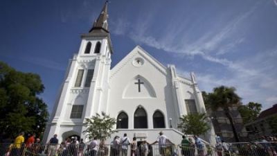 أناس يتجمعون امام كنيسة كنيسة ايمانويل الأسقفية الميثودية للأفارقة في تشارلستون بولاية ساوث كارولاينا الامريكية