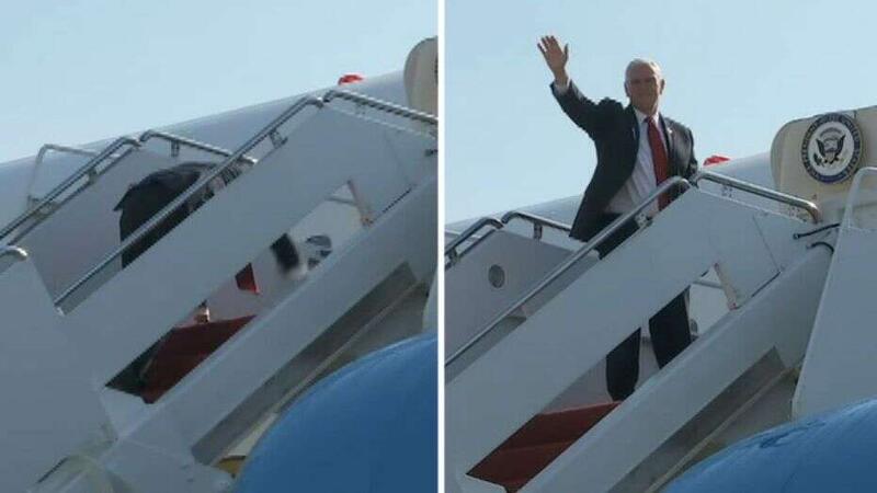 وقام بنس البالغ من العمر 61 عاما بالصعود على سلم الطائرة في مشهد يوحي بالخفة والرشاقة وصغر السن، لكنه تفاجأ بوقوعه على آخر السلم قبل وصوله إلى باب الطائرة، وقام بالاستناد إلى يديه والقيام سريعا، ثم قام بالتلويح لمن يقفون أسفل الطائرة بأنه بسلام.