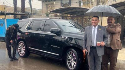 نائب عراقي من دولة القانون الموالية لايران يستمتع بالامطار وسط معاناة مرافقيه