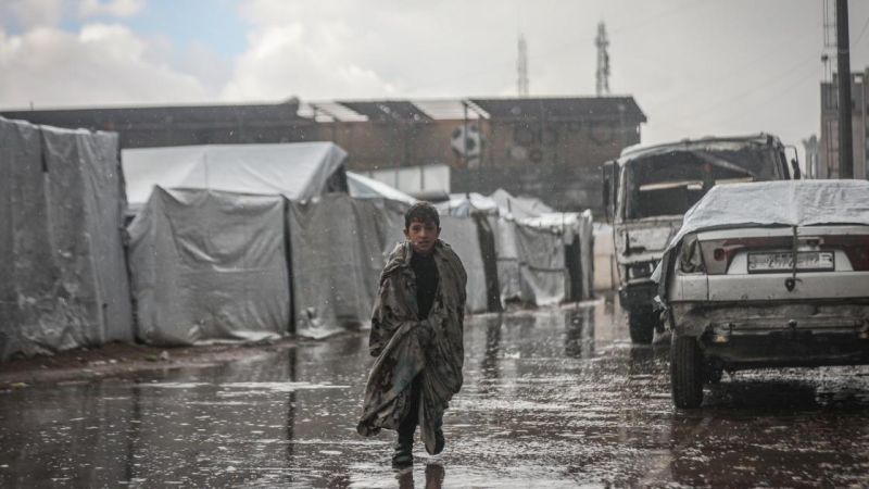 ومنذ فجر الجمعة، تتأثر الأراضي الفلسطينية بمنخفض جوي مصحوب بكتلة هوائية باردة ورياح وأمطار غزيرة، مما ضاعف من معاناة 1.5 مليون نازح في قطاع غزة بعد أن أغرقت الأمطار خيامهم البالية.