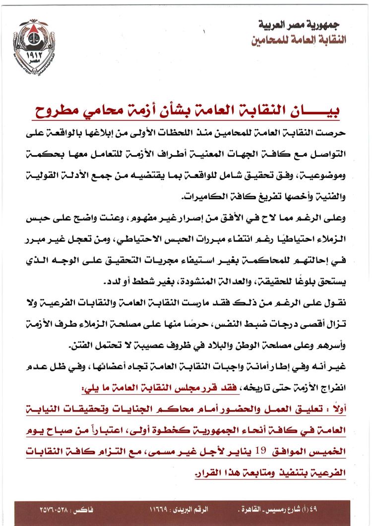 اعلنت النقابة العامة للمحامين المصريين تعليق العمل والحضور أمام محاكم الجنايات وتحقيقات النيابة في أنحاء البلاد اعتبارا من الخميس ولأجل غير مسمى، احتجاجا على حكم بسجن ستة محامين بعد ادانتهم بالتعدي على موظف محكمة.