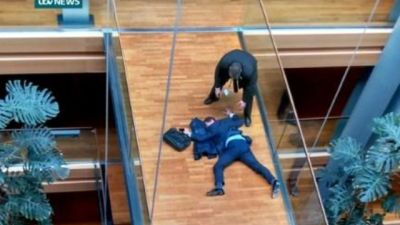 وفي صورة تضمنتها تغريدة لتلفزيون "اي تي في" يظهر رجل يرتدي بدلة رسمية قيل انه وولف ملقى ووجه على الارض في ممر في مبنى البرلمان المشيد من الزجاج والفولاذ والى جانبه حقيبة ومعطف.